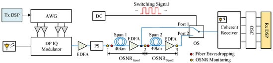 As the backbone of modern telecommunications, optical networks play a critical role in transmitting large-scale data. Notably, driven by the rapid development and widespread adoption of artificial intelligence (AI) and large language models (LLMs), higher demands have been placed on the transmission capability of optical networks [1,2,3,4]. While increasing the transmission capacity, the data security of optical networks is equally critical. Although the optical fiber is a kind of closed transmission media, unauthorized intruders can still eavesdrop on optical signals without interrupting fiber transmission. The currently known methods of fiber eavesdropping include fiber bending, optical splitting, evanescent coupling, fiber grating scattering, V-groove cut, and so on [5]. If we do not take protection measures against fiber eavesdropping, massive confidential data will face the risk of being deciphered.