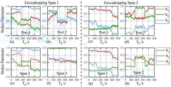 Here we first show the estimated SOP only with the optical signal received from port 1 or 2. The results are shown in Figure 15a–d. As we can see, when fiber eavesdropping happens in span 2, the SOP of span 1 was not affected, as shown in Figure 15c. However, when the fiber eavesdropping happens in span 1, the SOP estimated from two ports both have the characteristics of fiber eavesdropping, as shown in Figure 15a,b. If the fiber link is more complex, we cannot locate which span is being eavesdropping. For comparison, we select a transfer function in each period to represent the state of these links in this period and estimate the SOP for each span using our proposed multi-channel joint SOP estimation scheme. The corresponding results are shown in Figure 15e–h. It can be observed in Figure 15f that the SOP of the span 2 is not affected by the fiber eavesdropping at the span 1, which indicates the effectiveness of the proposed scheme.