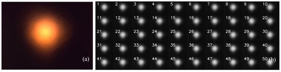 Each captured image underwent a structured preprocessing workflow to optimize the dataset for accurate and consistent analysis. The original beam profiles, as recorded by the CCD camera, are shown in Figure 2a. The images were first converted to grayscale to isolate the spatial intensity distribution and eliminate any potential color-channel interference, as illustrated in Figure 2b. This step ensured that only intensity values were retained for further processing. Following this, intensity normalization was applied across the dataset to correct any slight variations in exposure or laser output power, enabling a fair comparison of beam characteristics across all frames. Each grayscale image was then converted into a matrix format to prepare the beam images for numerical analysis, where each matrix element represents the intensity value of a corresponding pixel. This matrix-based representation allowed for the direct computation of key parameters such as beam centroid, FWHM, ellipticity, and asymmetry using mathematical operations on pixel data. In addition, all images were resized to a standardized resolution to ensure dimensional consistency across the dataset, which is essential for applying statistical algorithms and regression-based modeling techniques. These preprocessing steps ensured that the image dataset was uniform, comparable, and analytically robust, enabling the reliable extraction of beam properties and trend analysis across the full sequence.