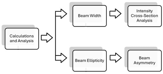 The numerical calculations were obtained from the preprocessed images, with the dataset consisting of matrix-form values extracted directly from the image data. Figure 3 presents a block diagram summarizing the core components of the laser beam analysis methodology. The process begins with calculations and analysis, which is the overarching approach. This then branches into two major analytical paths: beam ellipticity and width. Each of these is further examined through detailed sub-analyses; beam asymmetry stems from ellipticity, while intensity cross-section analysis builds on beam-width evaluation. This structured layout illustrates the sequential and interconnected nature of the statistical and numerical methods used in the study.