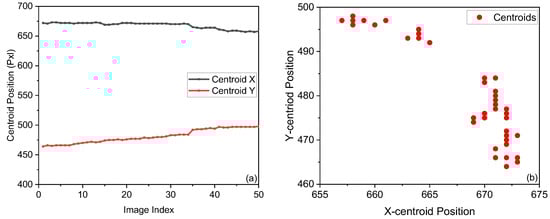 Beam centroid position analysis: (a) centroid positions over 50 images show a stable X-centroid and the Y-centroid; (b) scatter plot of X vs. Y centroids, indicating systematic beam drift.