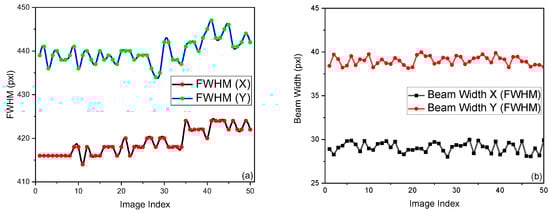 Figure 5a shows the variation of X- and Y-direction FWHM values across the entire image sequence. The red curve represents FWHM along the X-axis, while the green curve corresponds to the Y-axis. The X-FWHM starts at approximately 415 pixels and gradually increases to around 425 pixels, showing a consistent broadening trend. This behavior indicates horizontal beam divergence or degradation of collimation quality over time, potentially due to thermal-lensing effects. Meanwhile, the Y-FWHM fluctuates between 435 and 445 pixels, with an insignificant upward or downward trend. This relative stability suggests that the vertical beam profile remains more robust against temporal distortions. This lack of significant vertical divergence may be attributed to more uniform thermal dissipation or symmetric mechanical constraints in the vertical plane, which reduce the likelihood of thermal lensing effects compared to the horizontal direction. However, minor oscillations in the Y-FWHM indicate localized fluctuations, possibly caused by mechanical vibrations or minor air turbulence within the beam path. Figure 5b plots the pixel-normalized FWHM values to further validate the beam dimensions’ stability. The X-FWHM (black curve) maintains a tight band between 28 and 30 pixels, showing smaller variations than the full-frame FWHM values. The Y-FWHM (red curve) fluctuates and remains within the 38 to 40 pixels range. These patterns confirm that the horizontal beam profile is subject to a gradual divergence, whereas the vertical profile remains comparatively steady. This analysis underscores the importance of monitoring beam width over time. Changes in FWHM can significantly affect system performance, especially in tightly focused applications or when beam delivery systems rely on precise spatial confinement. The early detection of beam broadening allows for timely realignment, lens replacement, or thermal compensation to maintain optimal operation.