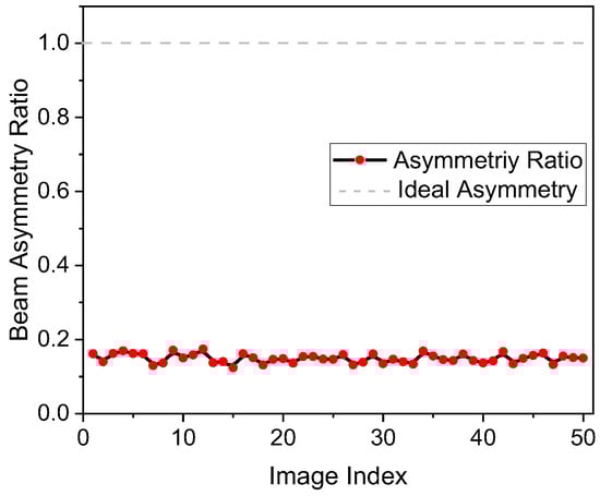 The plot in Figure 7 illustrates the Beam Asymmetry Ratio as a function of the Image Index, covering 50 different beam profile images. The red markers connected by a line indicate the measured Asymmetry Ratio for each image, while a dashed horizontal line at y = 1.0 represents the reference for an ideally symmetric beam. The Asymmetry Ratio remains consistently below 0.2, with minor fluctuations, suggesting that the beam profiles are relatively symmetric. The values mostly range between 0.1 and 0.2, without significant deviation, indicating that the beam maintains a stable shape throughout all 50 images. However, all the Asymmetry Ratios are still below 1.0, meaning the beam is consistently stretched along the Y-axis. The fact that the Beam Asymmetry Ratio never reaches the ideal value of 1.0 confirms that the beam does not exhibit extreme asymmetry and remains well-controlled.