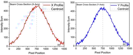 Beam cross-sectional intensity profiles: (a) along the X-axis and (b) along the Y-axis, illustrating the beam’s spatial intensity distribution. These profiles are obtained by summing intensity values across each axis, which can result in a broader visual spread than the frame-by-frame FWHM measurements shown in Figure 5.