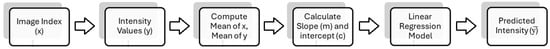 y is the predicted intensity (either vertical or horizontal), x is the image index, m represents the slope of the regression line, and c is the intercept. To determine the best-fit line, we first computed the mean of x (image index) and y (intensity values), given by Equations (7) and (8).