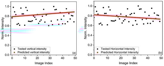 Tested value and predicted value of the normalized intensity, (a) vertical intensity shows a slightly increasing trend, (b) horizontal intensity shows a slightly decreasing trend, true values (black) are scattered, whereas predicted values (red) follow a trend.