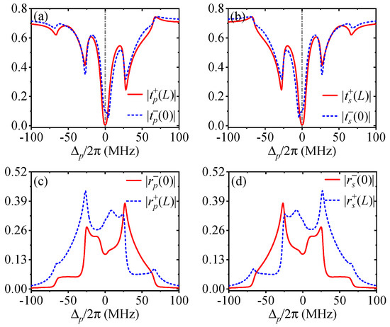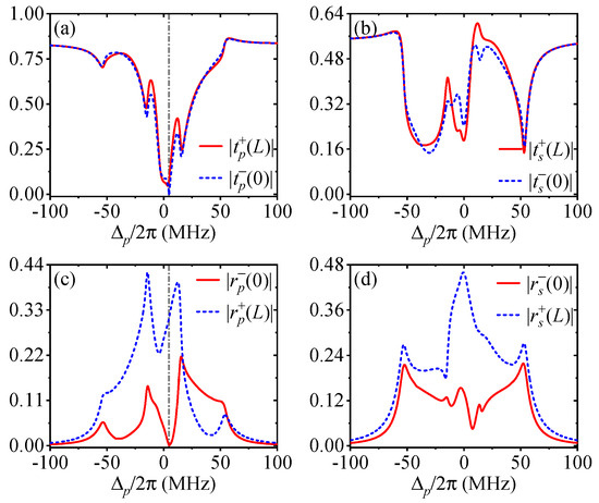 (compare the red solid and blue dashed lines), while the direct transmissions and cross reflections are reciprocal with