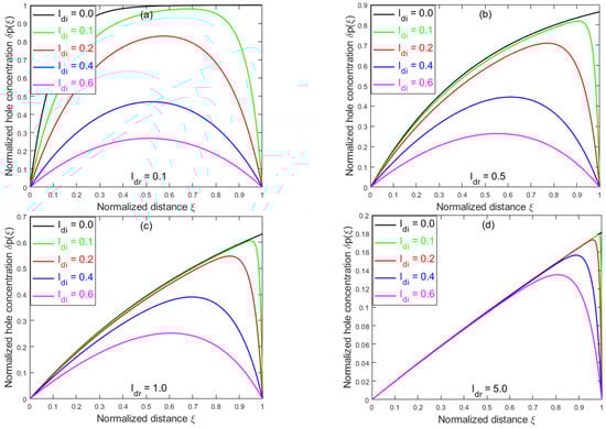 Normalized spatial distributions of photogenerated holes for different combinations of diffusion and drift parameters, : (a) ; (b) ; (c) ; and (d) .
