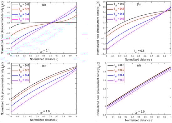 Normalized spatial dependencies of hole photocurrent densities for different combinations of diffusion and drift parameters, : (a) ; (b) ; (c) ; and (d) .