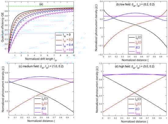(a) Quantum efficiencies (dashed lines) and (solid lines) vs. drift length for different values, whilst the green line represents the maximum quantum efficiency . The total normalized photocurrent density , electron component , and hole component vs. normalized distance , compared to the spatially average photocurrent density for three different () combinations: (b) low field ; (c) medium field ; and (d) high field .