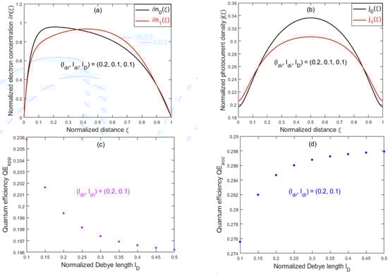 The impact of polarization effect on the excess carrier distributions and photocurrent density: (a) normalized carrier distributions and vs. normalized distance ; (b) normalized spatial photocurrent densities and vs. normalized distance ; (c) quantum efficiency vs. normalized Debye length ; and (d) quantum efficiency vs. normalized Debye length .