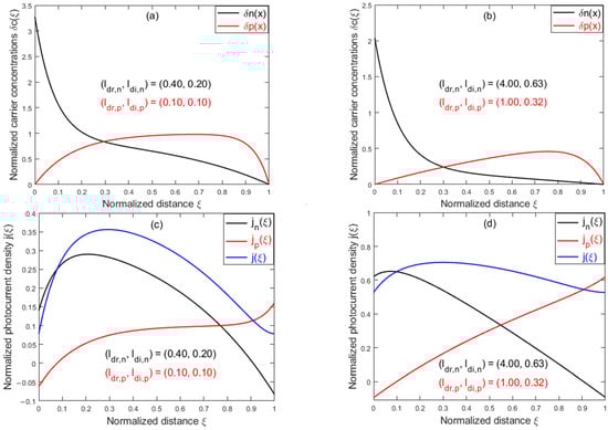 The physical explanation is that when electrons coming out of the anode cannot be accepted by the cathode at the same rate when , an accumulation of electrons will occur at the boundary with the anode. From , one can see that if is satisfied, will automatically be satisfied as well. Therefore, we need to find that can satisfy . One possible solution is to allow , whilst other BCs are kept unchanged. Although an analytical solution can still be obtained, it is too complex to be shown here. Thus, only numerical results for are given to illustrate the effects. Figure 5a,b plot the carrier distributions of the electrons and the hole, and , respectively, for two different combinations of and . Figure 5c,d plot , , and , respectively, for the same set of parameters. As expected, with increasing drift and diffusion parameters, both components tend to become linear; thus, the total photocurrent tends to become uniform.