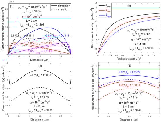 Thirdly, we examine the differences in the spatial variation in the photocurrent. By using the simulated carrier densities from Figure 6a, we calculate the spatial variations in the photocurrents by using Equation (7), in which the electric field is obtained by integrating Equation (7c), while keeping same voltage difference between the electrodes as the applied voltage. The results are shown in Figure 6c,d (solid curves), in comparison with the results of the analytic model (dashed curves) for 0.1 V, 1.0 V, and 2.0 V. Due to the singularity in taking a derivative using the numerical data, out of 150 data points, the last 2 data points closest to the respective electrode are found unreliable, and, thus, they have been omitted in the plots. However, the extrapolated values at the electrodes are close to the direct current outputs of the simulations. Thus, the values of the simulation current are used for the end points at and . Clearly, the total current remains nonuniform, with a maximum at the center, with comparable modulation amplitudes compared to the analytic results. The ratios between the maximum and minimum points are found to be 1.611, 1.205, and 1.108, from the analytic results, compared to 1.382, 1.099, and 1.050 from the simulation results, for 0.1 V, 1.0 V, and 2.0 V, respectively, and the photocurrents become more uniform under a larger applied electric field. In addition to the systematically larger compared to that of the analytic model , the simulated results show upward bending near the end points.