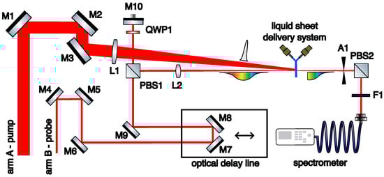 Experimental setup for PM-FROG using a 24 fs, 8 mJ, 50 mm diameter, compressed pump pulse and a chirped (1–8 ps), 25 µJ, 20 mm diameter probe pulse. M1-10—mirrors, L1—lens f = 1000 mm, L2—lens f = 600 mm, PBS1-2—polarizing beamsplitter cube, QWP1—quarter waveplate, F1—filter, A1—aperture.
