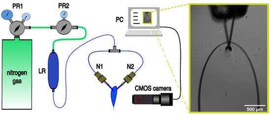 Experimental setup for creating and imaging targets from two colliding microjets. PR1, PR2—pressure regulator, LR—liquid reservoir, N1, N2—nozzles. Image of the liquid sheet used in the PM-FROG experiment, formed from two 50 µm nozzles at 90 degrees angle and 2.4 bar supply pressure.