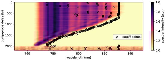 We used a direct, non-iterative algorithm to extract the spectral phase from the PM-FROG measurements. The raw data consist of runs during which the transmitted spectra of Pulse B were recorded as a delay between the two pulses was scanned. In this section, we use a measurement taken with the best-performing target, the liquid sheet, to demonstrate the reconstruction algorithm. Figure 3 shows the raw data for a 1 ps pulse sampled using a plasma mirror, displayed as a 2D spectrogram. First, the cutoff wavelengths in each of the spectra were found by choosing the point where the transmission of the plasma mirror switching reached 50%. The cutoff points are also shown in Figure 3. Outside the region where the plasma mirror forms during Pulse B, the cutoffs are noisy, which is an artifact caused by the difficulty of normalizing spectra. However, the noisy range of the data is outside the spectral sweep, and is not used in the analysis.