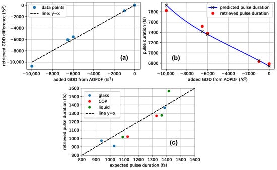 Figure 6a shows a comparison between the added dispersion from the AOPDF and the relative change in the retrieved GDD when using the glass slide. The measured GDD differences deviate from the applied GDD changes with a RMS relative error of 6.2%. Furthermore, Figure 6b compares the retrieved pulse duration values with the theoretically expected pulse durations, which were calculated from the Fourier-limited pulse corresponding to the reference spectrum, using the formula from ref. [34]. The measurements have a 1% RMS deviation from the theoretically expected values, which confirms the successful implementation of the PM-FROG method.