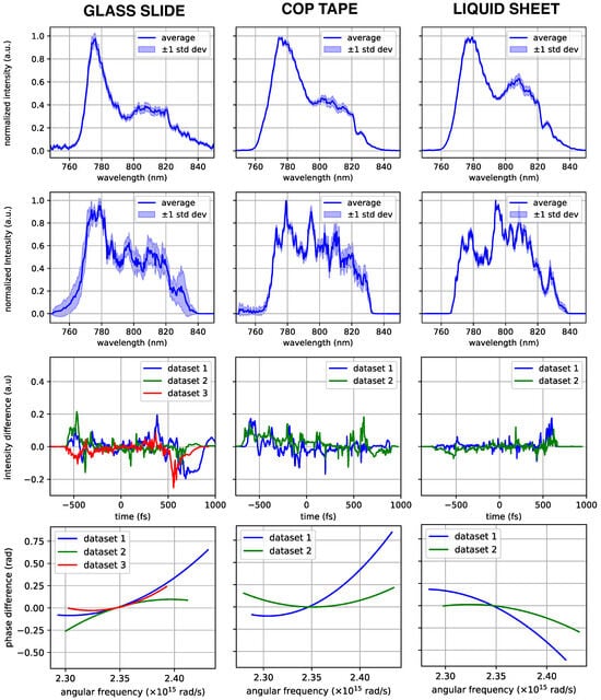 Row 1: mean spectrum and standard deviation recorded at the output of the laser amplifiers before interaction with the substrates. Row 2: average spectrum and standard deviation recorded during measurements with three substrates—glass, cyclo-olefin polymer (COP), and liquid—on different days. Significant spectral broadening in the blue region is observed for the glass substrate, attributed to self-phase modulation (SPM). Row 3: differences in temporal intensity between odd- and even-numbered subsets of the recorded spectra. The liquid substrate shows the smallest differences, indicating reduced noise and higher precision in temporal intensity reconstruction. Each data set corresponds to a different measurement taken on the same day using the same substrate. Row 4: differences in spectral phase between odd- and even-numbered subsets, showing minimal variation across the three substrates.