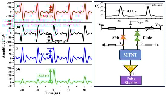 (a) APD-generated spike noise; (b) diode-stimulated spike noise; (c) differentially suppressed noise; (d) avalanche signal; (e) schematic of the capacitance-balancing circuit. Point a: output of the APD; Point b: the output of the diodes; Point c: output of the MTNT.