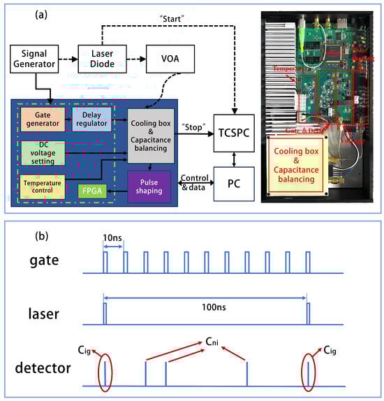 Based on the scheme in Figure 2e, we integrate the SPAD with modules, including a temperature controller, cooling box, gate generator, pulse-shaping unit, delay regulator, DC voltage setting, and FPGA. Through a USB interface connected to the computer, the FPGA serves as a core data processing component. The flowchart and physical picture of the InGaAs/InP SPAD-based detector are displayed in Figure 3a. The APD is cooled by a thermoelectric cooler to −50 °C to reduce its dark current. A temperature-control module is equipped with a high-precision thermistor and a fast negative feedback circuit, ensuring that the operation temperature of the APD does not vary more than 0.1 °C under different working conditions. Moreover, the capacitance-balancing circuit is placed in the cooling box to decrease the parasitic capacitance of the APD and electromagnetic interference from the environment. The gate generator module produces gating pulses triggered by the FPGA with a tunable repetition frequency from 1 to 200 MHz. The pulse width and Vgate are adjustable, while they remain the same at different gating repetition frequencies (fgate). The DC voltage-setting module is used to change the VHV with a resolution of 0.1 mV, guaranteeing the precise control of the avalanche gain of the APD. Finally, the avalanche signals are converted to digital signals by a pulse-shaping module and then sent to the FPGA to count the avalanches while outputting a synchronized digital signal.