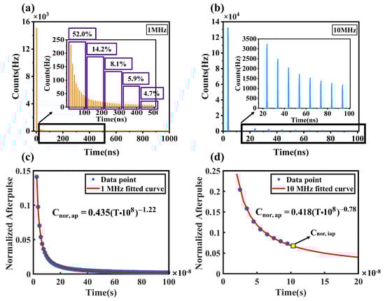 T is defined as (10 N + 5) × 10−9 s, where N is the Nth non-illuminated gate after the illuminated gate. Here, N should be greater than 2, considering the dead time of the detector is ~13 ns. α is an effective decay constant, and A is the pre-factor. By fitting the data with time, we extract the corresponding values of A and α. As displayed in Figure 4c, A = 0.435 and α = −1.22 are found to exhibit the best fit when flaser = 1 MHz. The fitted curve in red and the data points in blue exhibit a high degree of overlap. At flaser = 10 MHz, the corresponding values of A and α are 0.418 and −0.78, respectively, as shown in Figure 4d. The fitted curve also fits the data points well. Hence, we can predict the afterpulses in the illuminated gate (Ciap) as well. The yellow square point in Figure 4d is regarded as the number of normalized afterpulses in the illuminated gate (Cnor,iap). As previously mentioned, the afterpulses are not fully released during the 100 ns laser cycle, which results in the inaccurate calibration of the PDE and Pap. The utilization of predicted values is demonstrated to resolve this issue. By subtracting Ciap from the illuminated gate counts and adding it to the non-illuminated gate counts, we propose two formulas to calculate the PDE and Pap that correspond to all gates.