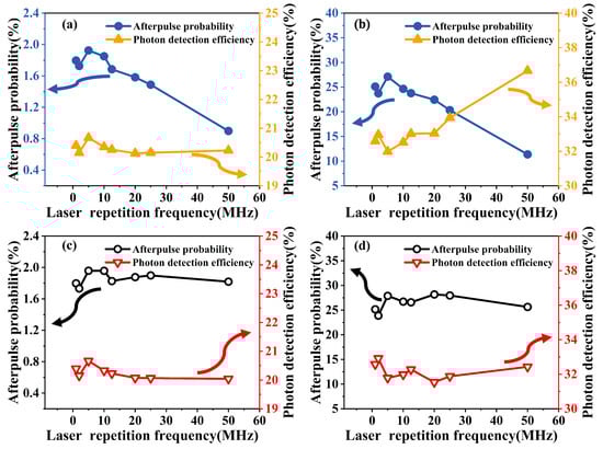 First, we choose flaser values of 1 MHz, 20 MHz, and 50 MHz to characterize the SPAD, as outlined in Table 1. The R grows steadily with a step of 5% by increasing the VHV applied to the APD. Concurrently, the dark count rate increases slowly with the SPAD’s total count rate. Compared with the afterpulses, the dark counts can almost be ignored. With the increase in R, the calculated PDE (η) and Pap, which follow Formulas (1) and (3), increase. The increase in PDE slows down, especially once R exceeds 35%. In contrast, the Pap rises significantly. For instance, the PDE increases slightly from 32.6% to 33.6% with R increasing from 40% to 45% at flaser = 1 MHz, while Pap increases from 25.1% to 35.5%. It can be deduced that Pap is a key parameter that limits the maximum PDE of the InGaAs/InP SPAD.