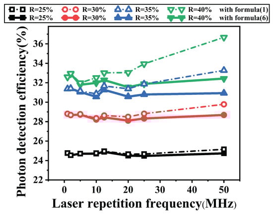 To demonstrate the correction effect of our method at different afterpulses in detail, we compare the PDEs calculated by Formula (1) and Formula (6) at the different R values while flaser ranges from 1 MHz to 50 MHz. The value of R increases steadily in steps of 5% and is set at 25%, 30%, 35%, and 40%. As displayed in Figure 6, the step of increase in PDE is not as consistent as that of R. As R increases, the increase in PDE becomes smaller. This phenomenon can be attributed to the rise in the afterpulses. With Formula (1), as R increases from 25% to 40%, the difference between the calculated PDEs becomes more pronounced at varying flaser values, particularly when R exceeds 35% and flaser surpasses 20 MHz. In contrast, the employment of our proposed Formula (6) ensures that the PDEs remain relatively constant across varying flaser values at diverse R values. When R = 25%, the two curves almost overlap each other. For instance, when flaser = 25 MHz, the PDE obtained with Formula (1) is 24.7%, while that for Formula (6) is 24.5%. However, if R = 35%, when flaser = 50 MHz, the PDE obtained with Formula (1) is 33.3%, with a value of 30.9% for Formula (6). Conversely, when flaser = 10 MHz, the PDE for Formula (1) is 30.9%, with a value of 30.6% for Formula (6). It can be concluded that the PDE can be precisely calculated with our method by effectively reducing the influence of afterpulses. Additionally, the reliability of this method is enhanced for the detectors of high Pap values.