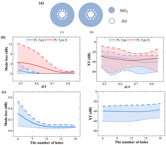 (a) Front view of the CA AHC and HA AHC. (b) The mode losses and XTs for PL Type II and PL Type I as d/Λ varies, and (c) the mode losses and XTs for PL Type I when the number of air holes changes. Here, the dashed, solid, and dot-dash lines denote the maximum, average, and minimum mode loss/XT, respectively.