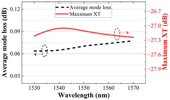 The average mode loss and maximum XT as a function of wavelength. The black arrow points to the coordinate axis of the dashed line, and the red arrow points to the coordinate axis of the solid line.
