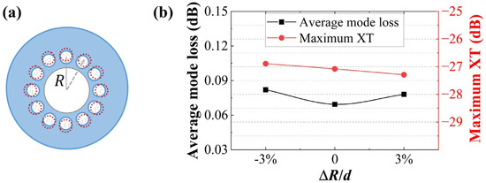 In addition, the schematic and results for the displacement of air holes from their optimal positions are presented in Figure 6, where ∆R denotes the radial displacement distance. For each air hole, ∆R is set within a range of ±3% of the air-hole diameter. The worst-case average mode loss and maximum XT are only 0.013 dB and 0.21 dB higher, respectively, compared to the pervious values.