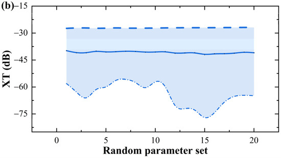 Here, a 3% maximum parameter variation relative to theoretical designs is employed. We randomly generate 20 sets of parameters to examine the mode losses and XTs for PL Type I. As shown in Figure 7, the average mode losses vary from 0.07 to 0.08 dB, and the maximum XTs range from −26.9 to −27.4 dB. The variations for average mode losses and maximum XTs are minimal, i.e., 0.01 dB and 0.5 dB, respectively. The minor degradation in the performance of PL Type I is attributed to the high refractive index contrast between the fiber cladding and the air–silica capillary. These results indicate that the variations in the average mode loss and the maximum XT due to fabrication errors are relatively small and acceptable, thereby demonstrating the excellent and stable performance of the proposed PL Type I.