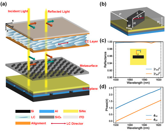 The overall configuration of the PI-LCoS device is depicted in Figure 1a. The metasurface layer is located between the LC layer and the backplane. When light is incident on the LCoS device, it is phase-modulated by the LC layer, which introduces a phase difference between the two orthogonal linear polarizations of the incident light due to the electrically controlled birefringence effect. The metasurface layer, in conjunction with the backplane, rotates the two orthogonal linear-polarized states of the incident light by 90 degrees after reflected, ensuring that both orthogonal linear polarizations are equally phase-modulated during the double-pass of the LC layer, and thus achieving polarization-independent phase modulation. The metasurface is configured as a periodic array of square cells, with each unit cell constituted by rectangular silicon pillars covered by SiO2 cladding, as depicted in Figure 1b. The direction of the silicon pillars forms an angle of with the x-axis.