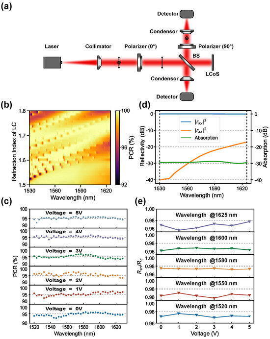 The polarization conversion ratio (PCR) is a crucial parameter for the PI-LCoS phase modulator, defined as [21], where and are the power of converted and non-converted polarization light, respectively. The schematic of the setup for the PCR measurement is shown in Figure 3a. Light emitted from the laser (Model: TLX5, Thorlabs, Newton, NJ, USA), is collimated and passes through a polarizer (P1), then through the beam splitter (BS), where it is divided into two paths. One beam is incident on the LCoS and reflected, then again reflected by the BS, passing through a polarizer (P2) and a focusing lens before reaching the detector. A second beam serves as the reference. The polarization of the incident and outgoing light can be selectively controlled by rotating P1 and P2, respectively. Figure 3b presents the simulated PCR results over the entire C+L band at the whole LC refractive index modulation range (as described in [22], corresponding to the various driving voltages). It can be seen that, in the majority of the regions, PCR exceeds 96%. The experimentally obtained PCR values are somewhat lower than the simulated values, primarily because of the omission of process-related factors that affect the PCR in the simulation. The PCR measurements were conducted for wavelengths ranging from 1520 to 1630 nm at various LCoS driving voltages, as shown in Figure 3c. The results clearly demonstrate that PCR is approximately 95% across the entire range of LCoS drive voltages for all wavelengths. Figure 3d illustrates the simulated absorption curve of light after reflection by the backplane integrating metasurface, indicating that the metasurface exhibits negligible light absorption. Reflectivity measurements were conducted for the PI-LCoS and the original commercial LCoS device, denoted as and , respectively. The ratios of the two reflectivities at various driving voltages are shown in Figure 3e. The ratios, at five different wavelengths covering the entire C+L band, remain above 96% throughout the LC driving voltage range, indicating a slight reduction in reflectivity due to the incorporation of the metasurface layer. This is attributed to the low absorption of silicon in the near-infrared spectra, which gives the metasurface the advantage of low loss. All of these simulation results were obtained by using the frequency-domain solver in the finite element simulation software CST 2023. The reflectance of co-polarized and cross-polarized light can be calculated based on the obtained S parameters.