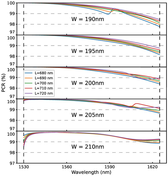 In the actual fabrication process, discrepancies between the actual and the design values may occur due to process errors [24]. Achieving a high tolerance for these process errors is a key objective in device design. In the proposed PI-LCoS, the width and length of the silicon pillars of the metasurface are two parameters that are particularly susceptible to variations. When the width W of the silicon pillars varies within nm and the length L varies within nm, the PCR performance of the LCoS was simulated, as shown in Figure 6. It can be seen that the PCR is greater than 97.5% throughout the C + L band, indicating that there is a process tolerance of nm for the width and nm for the length of the silicon pillars. Meanwhile, it can be seen that the resonance peaks in Figure 6 originate from the guided mode resonances of the silicon pillars, which are determined by the matching relationship between the width of the silicon pillars and the wavelength of the incident light. The silicon pillars and silica cladding form a high-low refractive index waveguide structure. When the incident light wavelength matches the width and period of the silicon pillars, guided modes within the pillars are excited (such as transverse modes corresponding to TE or TM polarization), leading to strong resonant responses at specific wavelengths. These resonance peaks enhance the polarization conversion efficiency at target wavelengths. The presence of the resonance peaks not only does not significantly degrade the device performance, but also optimizes the applicability of LCoS in optical communication and other scenarios by selectively enhancing polarization conversion in key bands. This phenomenon is consistent with the guided mode resonance theory of dielectric metasurface, and the experimental results verify the rationality of the design and process robustness.