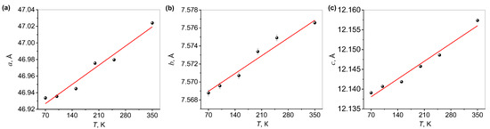 The room temperature (RT = 293 K) values in Table 1 were calculated from the linear fits to the data. The values reported in [3] at the same temperature, 47.135(16) Å for a, 7.578(3) Å for b, and 12.161(4) Å for c are slightly larger, but such deviations can be attributed to different growth conditions or to different diffractometer calibrations.