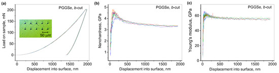 Loading/unloading curves (a), depth dependence of nanohardness (b), and Young’s modulus (c) of the b-cut PGGSe sample. The inset in (a) is a micrograph of the indents. Different colors represent the individual tests.