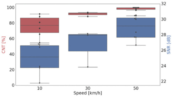 The aforementioned studies indicate a correlation between driving speed and the clarity of vehicle trajectories. However, a mathematical model that rigorously defines the logical relationship between these two variables is still lacking. Thomas et al. [76] experimentally investigated the performance of DAS signal quality at varying truck speeds. They introduced two DAS data quality indicators, namely, the signal-to-noise ratio (SNR) and continuity (CNT), to characterize the relationship between driving speed and DAS data quality. The definitions of the SNR and CNT are shown in Equations (2) and (3). The experimental findings reveal that when the truck speed was decreased from 50 km/h to 10 km/h, the SNR of DAS data decreased by an average of 4.0 ± 1.1 dB, and the CNT decreased by 23 ± 5.7%. The experimental results are shown in Figure 3. A box plot of the SNR and CNT is shown in Figure 4.