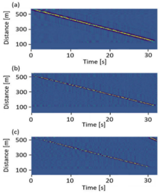 Space–time visualization of DAS data. The approximate average speed of the truck was (a) 50 km/h, (b) 30 km/h, and (c) 10 km/h [76].
