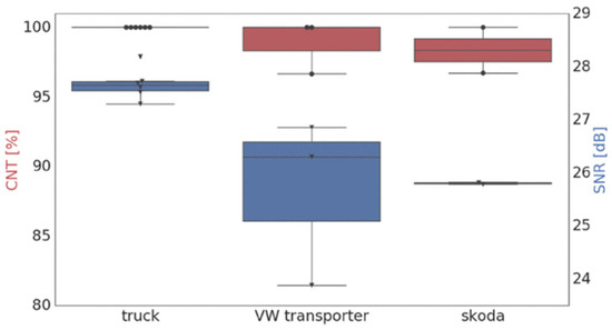 SNR (blue) and CNT (red) corresponding to different vehicle types. All vehicles were driving at 50 km/h [76].