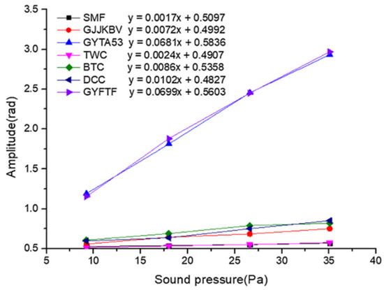 Phase demodulation results of seven cables at different acoustic pressures [81].