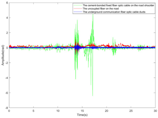 Common optical fiber deployment methods include installation overhead, underground, and within pipes [82]. The burial method used for in-ground installation affects the coupling used between the optical fiber and the surrounding media, which, in turn, greatly affects the signal data quality [83]. To determine the impact of optical fiber coupling conditions on data quality, Papp et al. [84] designed an experimental analysis to compare the differences in DAS signal quality under three coupling conditions: putty powder bonding, sandbag pressure, and steel nail fixation. The results were compared with the data recorded by the detector, and it was found that the recorded waveforms differed greatly among the three burial methods. The putty powder bonding coupling had the best effect, as shown in Figure 9.