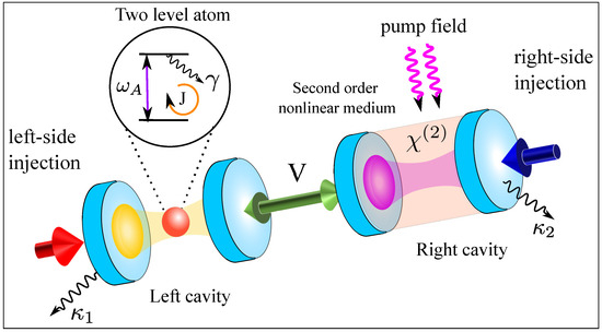 In this paper, we examine a system of two coupled cavities, as described in the literature [47,48]. The left cavity is strongly coupled to a two-level atom, while the right cavity contains a pumped second-order nonlinear material, which leads to the parametric interaction [49]. We note that quantum squeezing induced by the parametric interaction results in various quantum phenomena, such as nonreciprocal transmission [50], nonreciprocal photon blockade [51], nonreciprocal entanglement [52], and so on [53]. Here, we demonstrate that, in the absence of the parametric interaction, classical asymmetric behavior can be observed by detecting the transmitted photon intensity when the probe field is injected from different directions. However, when a parametric drive is applied, various quantum asymmetric behaviors can be achieved, including the squeezing, quantum statistics, and phase-space properties of the transmitted photons. We show that such kind of quantum asymmetric behaviors can be analyzed by measuring Klyshko’s figures of merit, the Wigner function, and the steady-state second-order correlation function, which may have potential applications in remote quantum communication, quantum sensing, and quantum networking [54,55].