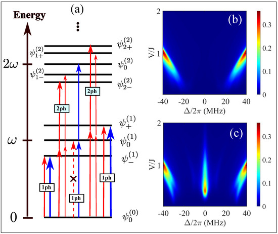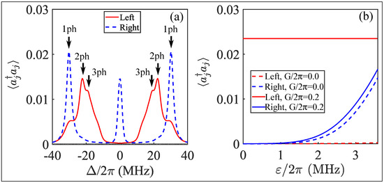 Case I. A probe photon is injected from the left side of the left cavity and detected on the right side of the right cavity. According to Equation (3), the transition [see the red dashed arrow in Figure 2a] is forbidden when the probe field is injected from the left side of the left cavity. Therefore, only two excitation pathways [denoted by 1 ph in Figure 2a], i.e., , are allowed in the single-photon space. This feature can be verified by numerically solving the master equation with dissipation, i.e.,