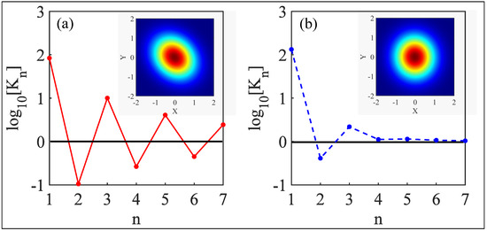 According to Klyshko’s criterion for nonclassicality, if any value is less than unity, the state of the transmitted photons is considered nonclassical. In Figure 4a, we observe that is less than unity for and 6 when the injection direction is from the left side of the left cavity, confirming Klyshko’s criterion. In contrast, when the injection occurs from the right side of the right cavity, the nonclassicality of the transmitted photon state is notably diminished, as for all photon numbers n except for [see Figure 4b]. Furthermore, the nonclassical nature of the transmitted photons can also be verified by calculating the Wigner functions, as shown in the insets of panels (a) and (b). When the probe field is injected from the left side of the left cavity, the transmitted field exhibits slight squeezing.