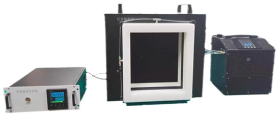 To address the temperature drift issue in uncooled detectors, a dual-blackbody calibration method, as proposed by Tang et al. [15], is employed. The procedure is as follows: Two standard blackbody radiation sources are positioned directly in front of the system, with one blackbody maintained at a fixed temperature and the other adjustable. Radiation and temperature calibration are performed using a large-area blackbody radiation source system, independently developed by the University of the Chinese Academy of Sciences, Hangzhou Institute for Advanced Study. The system consists of a temperature controller, a planar radiating cavity, and a water chiller. It provides a highly stable and uniform radiation reference for infrared systems, as shown in Figure 5. The technical specifications of the temperature-controllable blackbody source are as follows