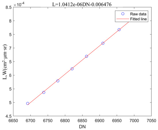 where and are radiometric calibration coefficients: represents the system responsivity, and is the response offset. The coefficients are determined using a least-squares algorithm to achieve calibration results for each channel.