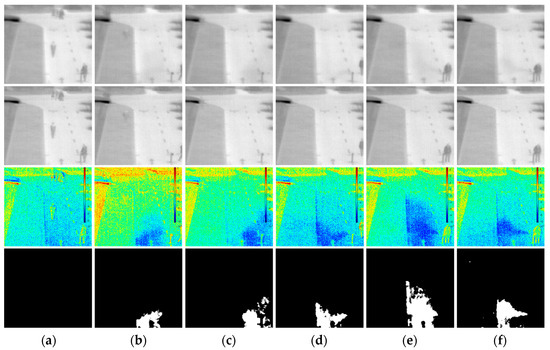 Figure 8 displays the detection results from an outdoor SF6 gas release experiment. Row 1: Absorption-band infrared images; Row 2: Non-absorption-band infrared images; Row 3: Radiation difference images (ΔL); Row 4: Threshold-segmented gas detection images. Columns represent sequential frames, illustrating the dynamic process of SF6 gas accumulation. As shown in the figure, gas detection remains unaffected by moving objects in the scene, while the algorithm accurately delineates the morphology of gas leaks and captures their temporal diffusion process from initial release to full development.