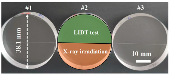 In this paper, three single CaF2 (111) crystals ( mm) prepared by Bridgman’s method with different growth conditions were selected as test samples, as shown in Figure 1. All samples in this study were prepared using the Bridgman method [26,27]. First, high-purity CaF2 raw material was accurately weighed, and several grams of lead fluoride (PbF2) was added as a deoxidizer to effectively eliminate moisture and oxide impurities (e.g., calcium oxide, CaO) adsorbed at high temperatures. Next, the weighed raw materials were thoroughly ground and mixed in a mixer to ensure a uniform distribution of components. The resulting homogeneous powder was then carefully loaded into a specially designed graphite crucible. The crystal growth process was conducted in a precisely controlled chamber, where the vacuum level and the meticulously regulated heating and cooling rates served as key process parameters determining the final crystal purity and crystallization quality (e.g., defect density and uniformity). Samples 1–3 are single CaF2 (111) crystals produced from distinct batches under varying growth conditions while being subjected to uniform processing conditions. Consequently, the surface roughness of the crystals is generally consistent, although variations in impurity content are observed, and we will describe the details below. A femtosecond pulsed laser (duration: 340 fs, fluence: 0.53 J/cm2) was utilized to mark the surface of each CaF2 crystal, and the test sample was divided into two regions for LIDT testing and X-ray irradiation experiments, respectively.