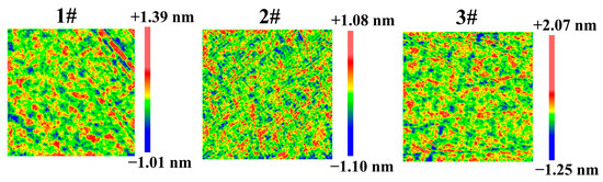 For the deep-ultraviolet (DUV) laser-induced damage threshold test, the surface roughness of the test material significantly influences the experimental outcomes. To objectively evaluate the influence mechanism of impurities on laser resistance properties, each CaF2 crystal underwent the same precision mechanical polishing process. The surface roughness of three test samples was characterized using a surface profiler with an accuracy of 0.2 nm (New View 8050), as shown in Figure 2. The surface roughness of each test sample was observed to be essentially identical, with RMS values all controlled under 0.3 nm (as shown in Table 1).