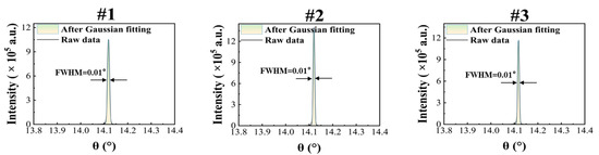The double-crystal rocking test of the CaF2 crystal was performed using a high-resolution X-ray diffractometer (Bruker D8-Discover), as shown in Figure 3. Each tested sample exhibited diffraction peaks at the 14.12° position, corresponding to the θ angle of the Bragg diffraction equation for the crystal plane (111) of CaF2. The half-peak widths, obtained via Gaussian fitting, were all 0.01°. Additionally, the diffraction peaks did not show obvious splitting or broadening, indicating excellent crystalline properties for the three test samples.
